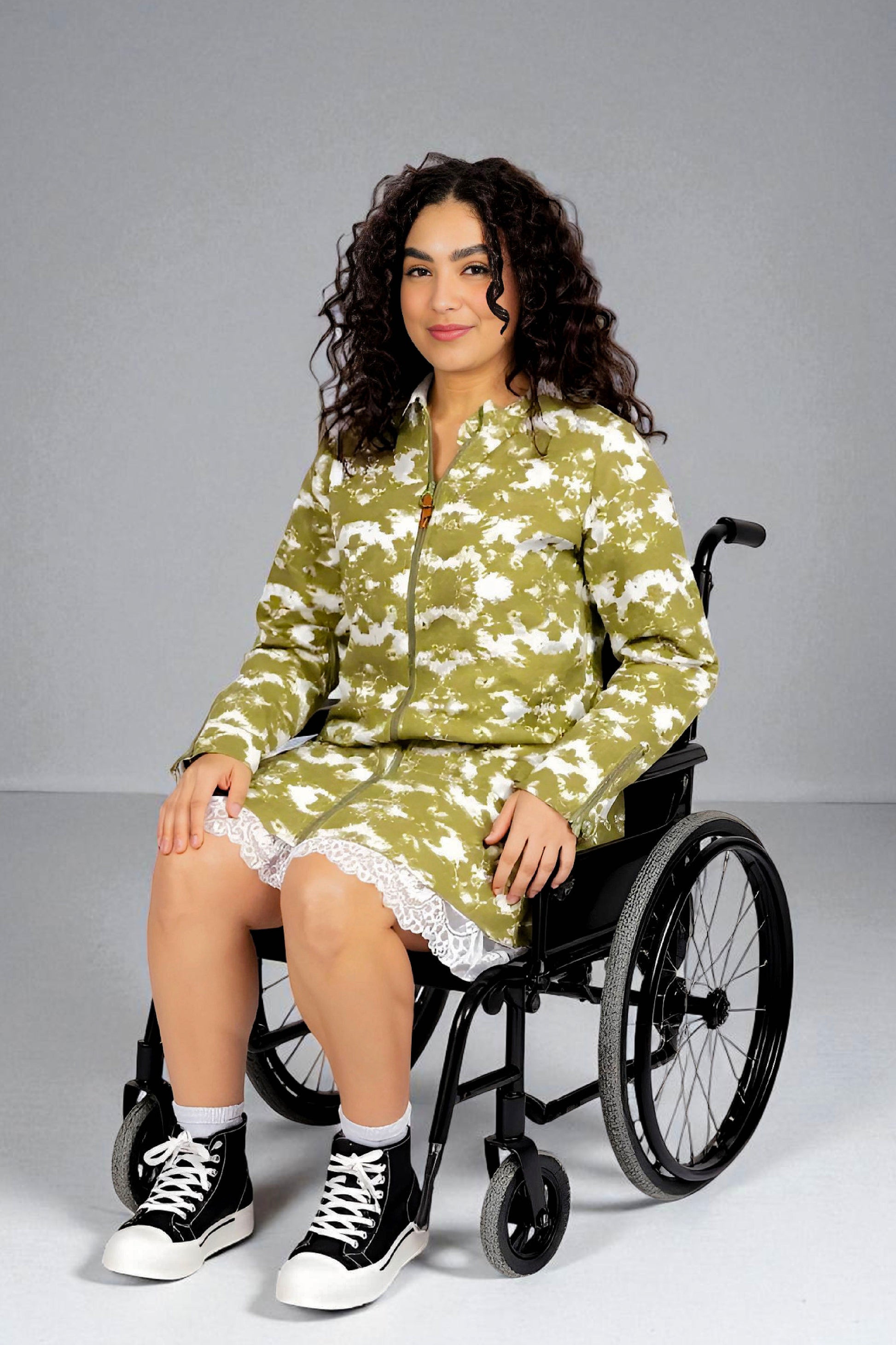 FUNCTIONAL DETAILS: Equipped with a zipper on the sleeve for effortless undressing, as well as a Claire button at the side seam and a small inside elastic for independence in the washroom, our dress ensures convenience and ease in every aspect of wear.