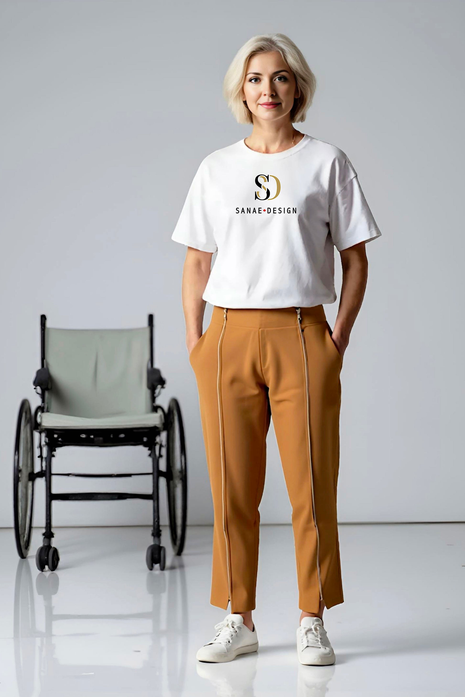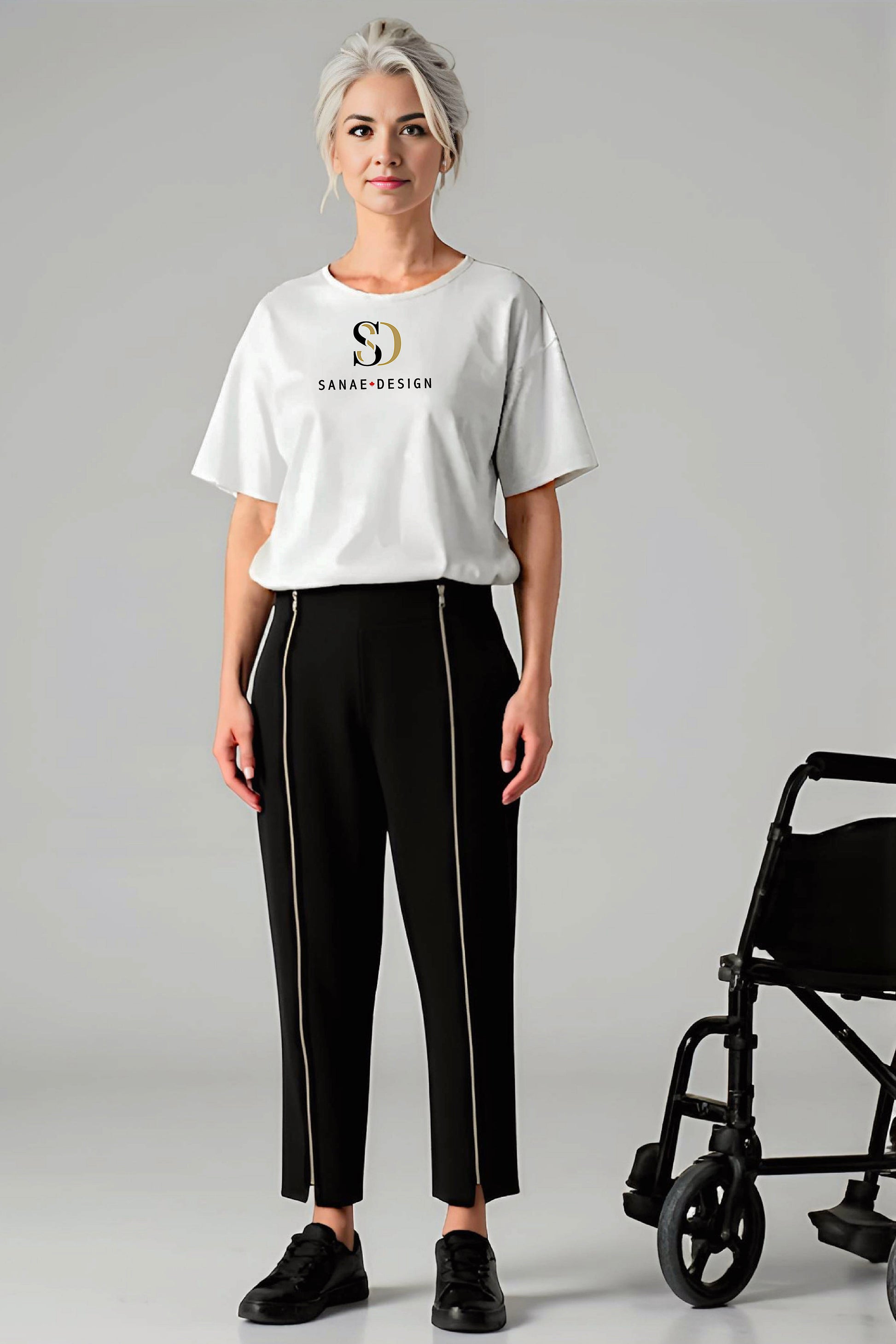 Introducing our specially designed Women’s Trousers Pant, tailored with thoughtful features for enhanced comfort and convenience. These trousers boast a back waist elastic, ensuring a snug yet flexible fit. Crafted from soft and stretchy fabric, they are designed to provide all-day comfort and support. The fashion-forward design includes a full-length zipper along the front of each leg, opening completely to facilitate easy dressing and undressing, especially helpful for individuals with mobility challenges. The zipper is discreetly placed to maintain a chic and classic look. Additionally, the trousers feature a side waist flap with adjustable sizing, ensuring a personalized fit. A side seam slide pocket adds functionality without compromising style, making these trousers a versatile and practical choice for everyday wear. Experience style and comfort combined in our Adaptive Women’s Trousers Pant. Perfect for all-day wear, these trousers offer functionality without compromising on elegance.